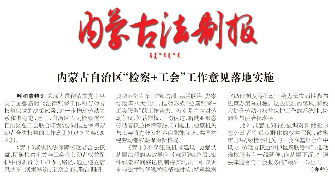 为深入贯彻落实党中央关于加强新时代法律监督工作和劳动者权益保障的决策部署,进一步推动劳动关系和谐稳定,近日,自治区检察院与自治区总工会联合印发《协同推进保障劳动者合法权益的工作意见》(以下简称《意见》)。