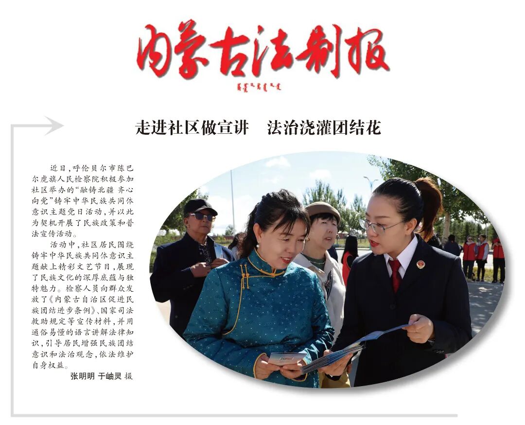 近日,呼伦贝尔市陈巴尔虎旗检察院积极参加社区举办的“融铸北疆齐心向党”铸牢中华民族共同体意识主题党日活动,并以此为契机开展了民族政策和普法宣传活动。