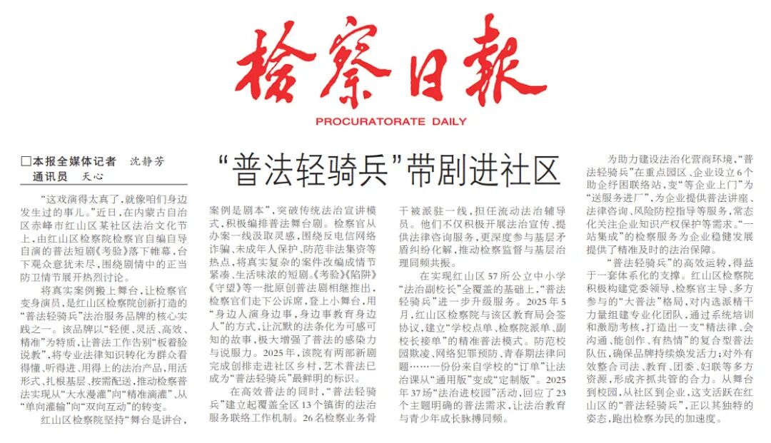 “普法轻骑兵”的高效运转,得益于一套体系化的支撑。红山区检察院积极构建党委领导、检察官主导、多方参与的“大普法”格局,对内选派精干力量组建专业化团队,通过系统培训和激励考核,打造出一支“精法律、会沟通、能创作、有热情”的复合型普法队伍,确保品牌持续焕发活力;对外有效整合司法、教育、团委、妇联等多方资源,形成齐抓共管的合力。从舞台到校园,从社区到企业,这支活跃在红山区的“普法轻骑兵”,正以其独特的姿态,跑出检察为民的加速度。