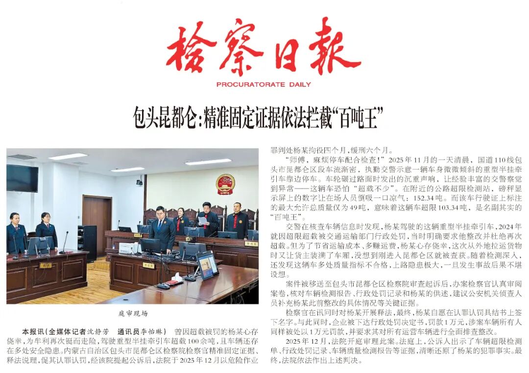 2025年12月,法院开庭审理此案。法庭上,公诉人出示了车辆超限检测单、行政处罚记录、车辆质量检测报告等证据,清晰还原了杨某的犯罪事实。最终,法院依法作出上述判决。
